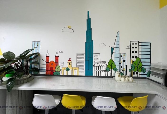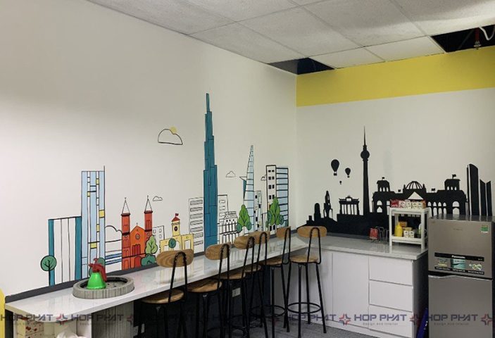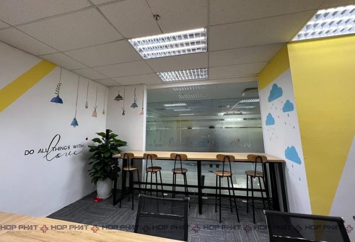 Sau khi khách hàng hài lòng với bản vẽ 3D công ty thiết kế, sẽ đến giai đoạn triển khai kỹ thuật thi công nội thất và hoàn thiện công trình. Cẩn thận đến từng chi tiết, tỉ mỉ từ phòng họp cho đến góc pantry. Màu chủ đạo tràn ngập sắc vàng xen kẽ trắng sẽ đem lại cảm giác tích cực, kích thích sự sáng tạo và tăng ý chí làm việc cho nhân viên.